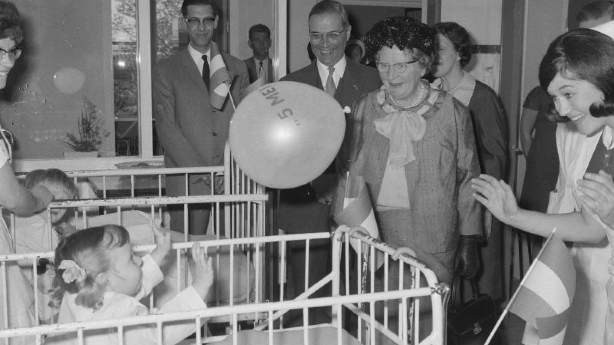Foto: De toenmalige koning Juliana bezoekt een kinderziekenhuis.